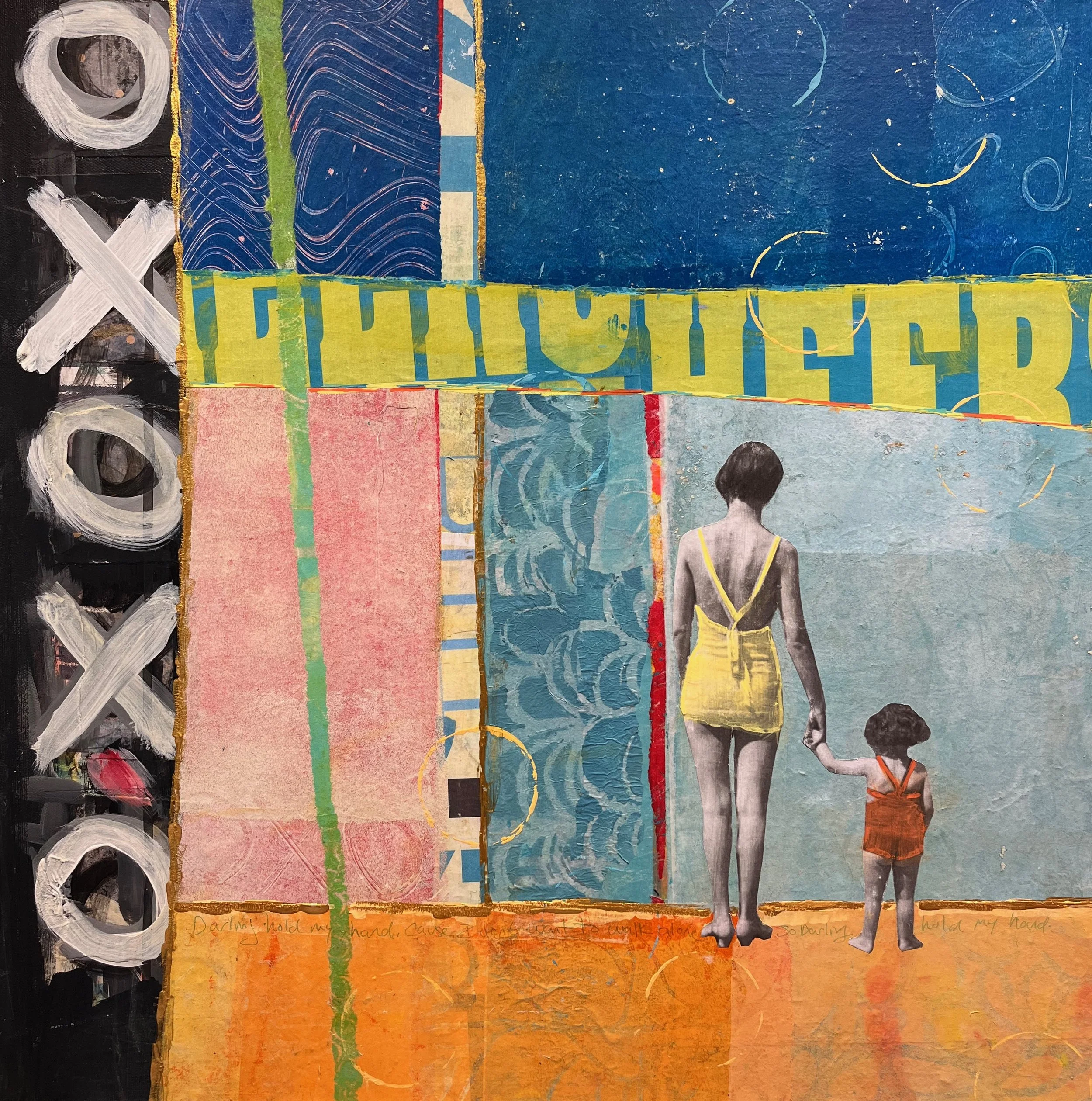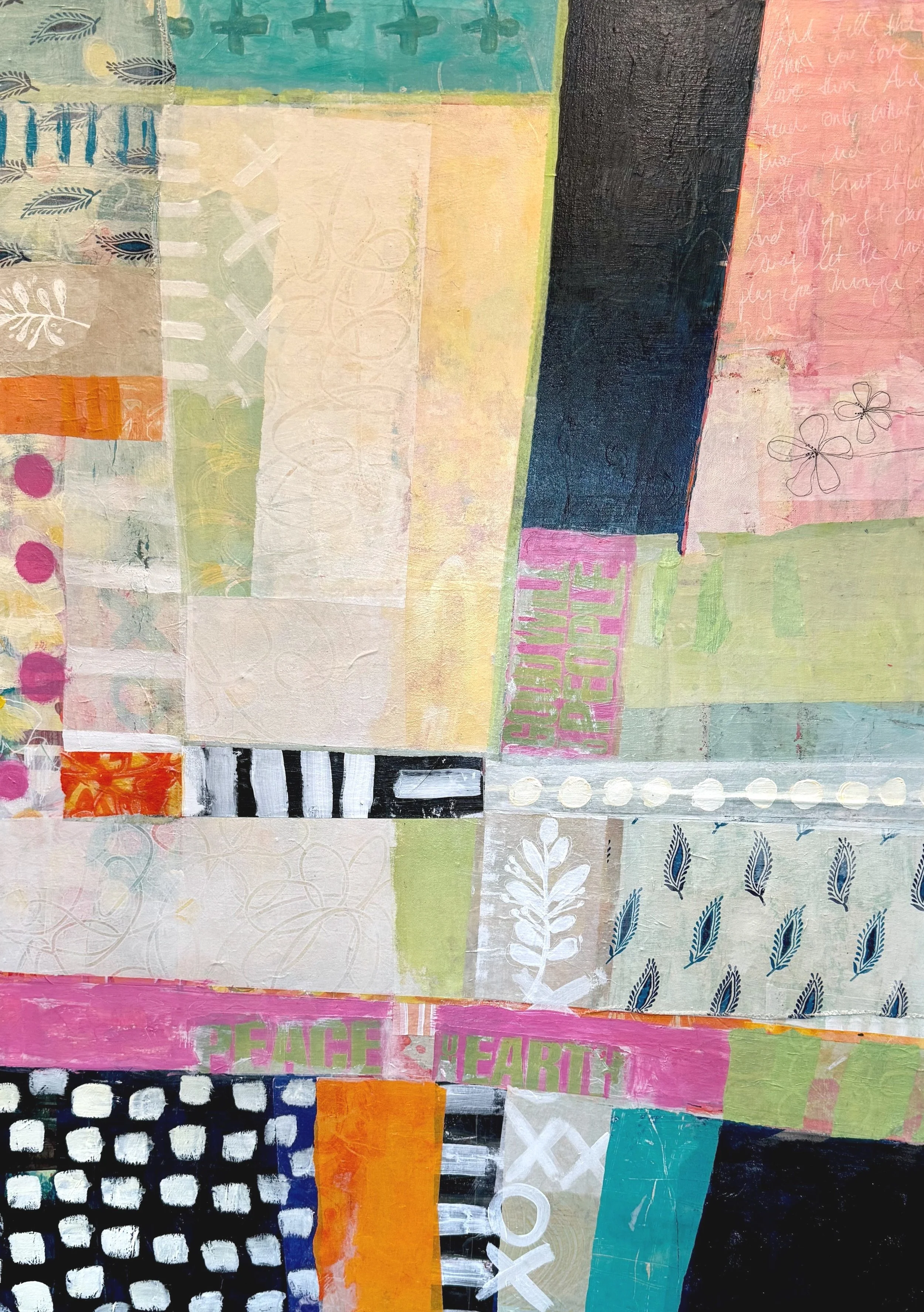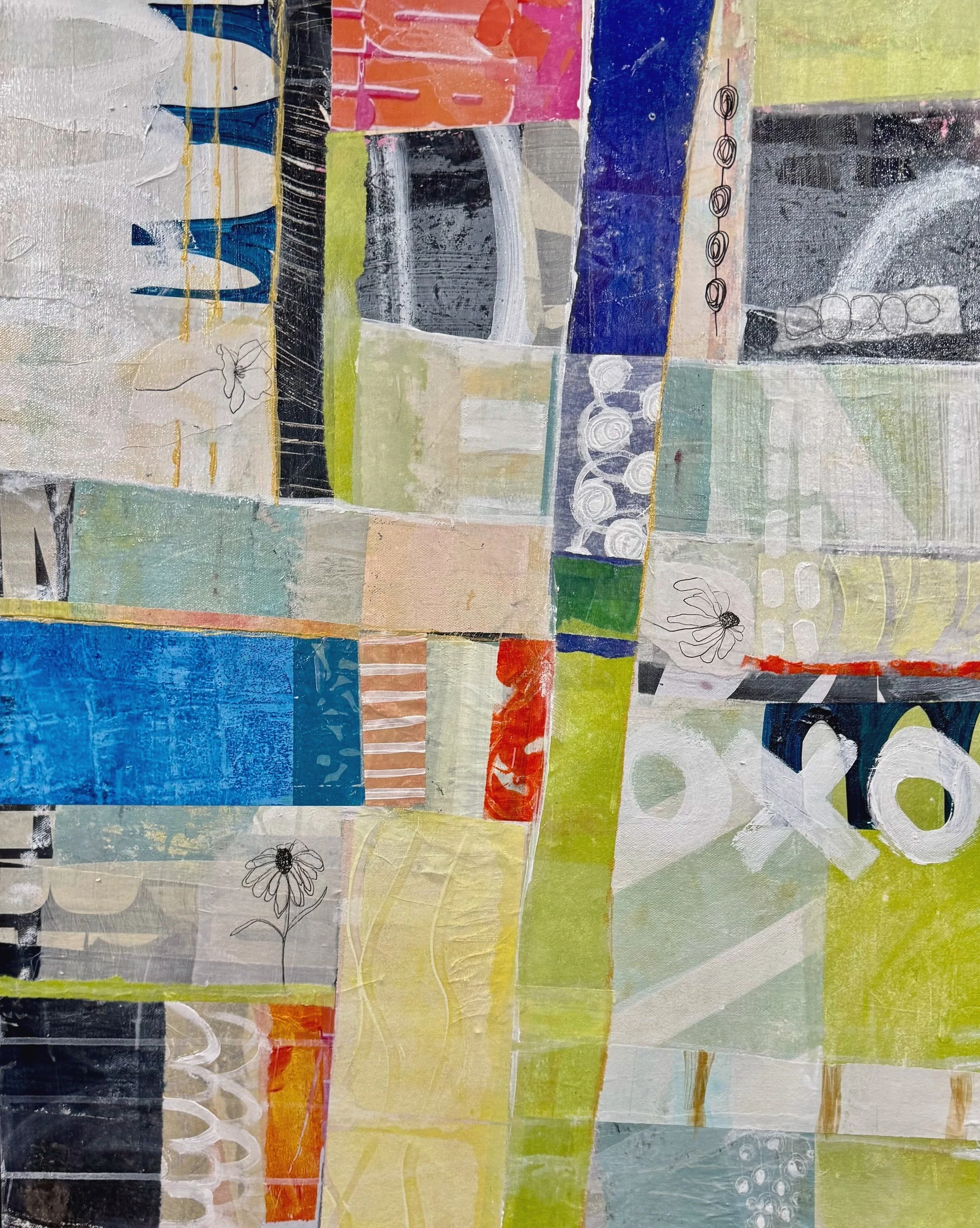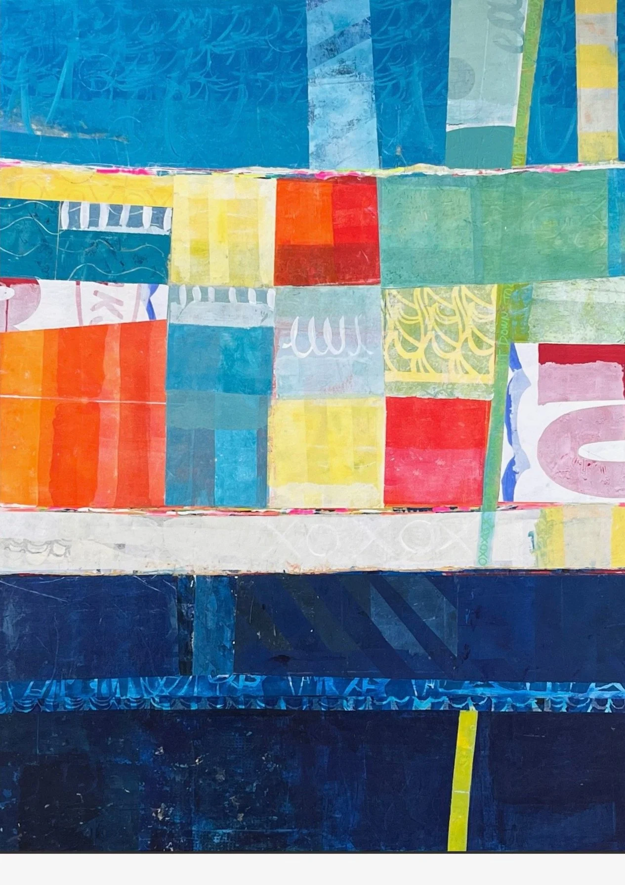 Almost all of my work is layered and filled with colors, shapes, words and images. It tends to be bold, bright, musical, and eclectic. I have always enjoyed the challenge of a sky full of beautiful clouds. And I am continuously drawn back to my own playful approach to making high impact, abstract art.